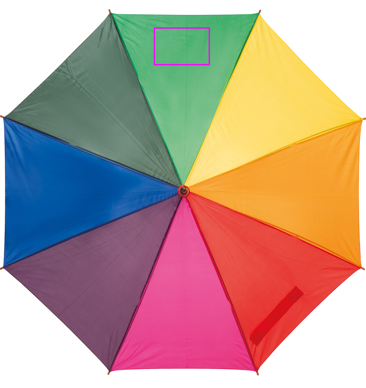 Attraktiver, mehrfarbiger Automatik-Stockschirm mit gebogenem Holzgriff. Ihr Logo drucken wir auf ein Segment.