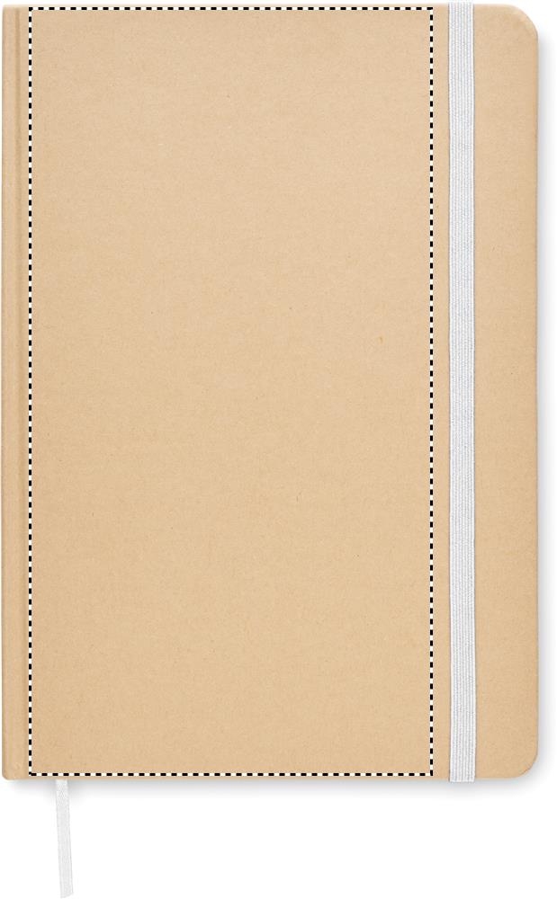 A5 notebook with hard recycled carton cover. Casebound. 160 squared recycled pages (80 sheets). Elastic closure strap, ribbon bookmark.