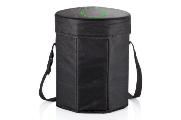 600D polyester in black with PE coating, 30cm diameter, foldable. Usable as cooler and seat.