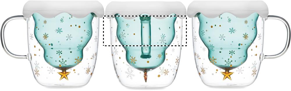 Double wall borosilicate mug with seasonal design and silicone lid and coaster. Capacity: 250ml.