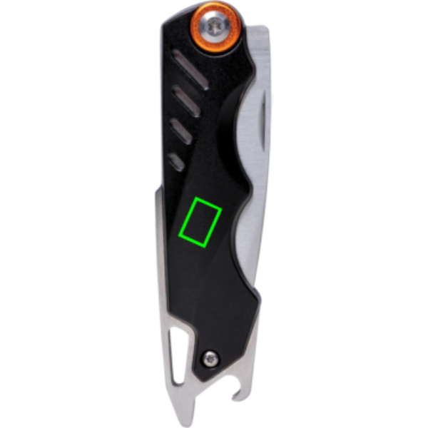 Ultra-strong knife with 4 functions. Packed in luxury gift box including high quality 1680D pouch. Aluminium material body and stainless steel tools. Tools included: Foldable blade, liner lock, belt clip, bottle opener.