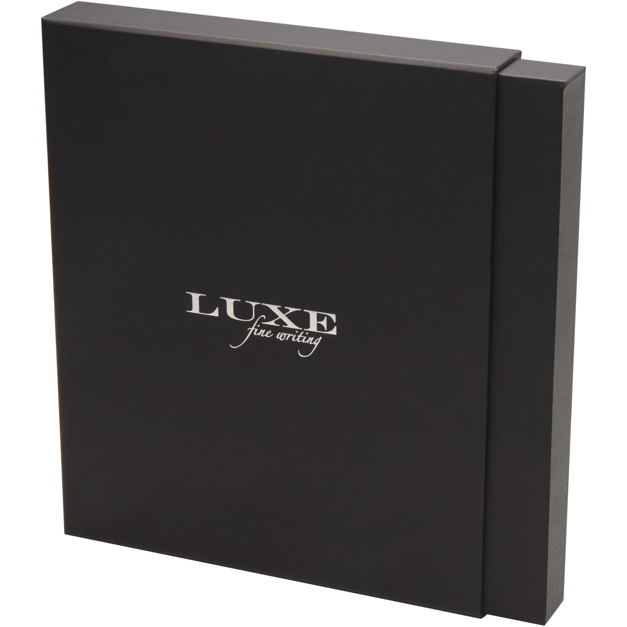 The Legato set is an elegant combination of an A5 notebook and a rollerball pen. The pen has a RCS certified recycled brass upper barrel with silver chromed finish, lower barrel with a colour spray coating finish, metal silver chromed accessories, and a LUXE logo on the mid ring. Ink colour: Blue. Writing length: 400 metres. Nib size: 0.7 mm. Extra refill in black colour included. The notebook has 80 sheets of 80 g/m² lined cream-coloured paper, and has a recycled leather-like plastic cover, an elastic closure, ribbon marker, and accordion pocket. Silver chromed metal accessory on the elastic closure. Delivered in a cardboard gift box.