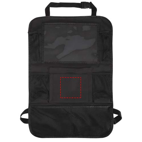 Car back seat organiser with multiple mesh pockets to hold essentials such as snacks, toys, or bottles, plus a PVC window for a tablet. It attaches easily to the front seat and helps keep your car tidy and clutter-free – ideal for families, road trips, or everyday use.