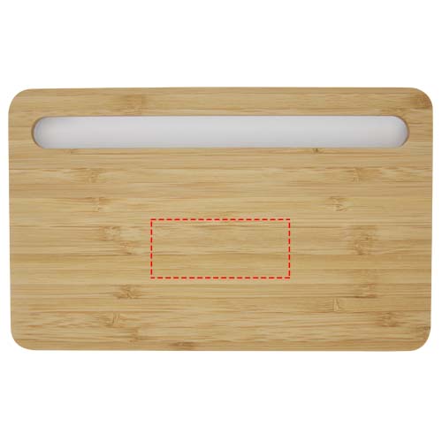 10W bamboo wireless charger integrated with phone holder, compatible with all Qi devices (iPhone 8 or above and Android devices that supports wireless charging). Delivered in gift box with an instruction manual (both made of sustainable materials).