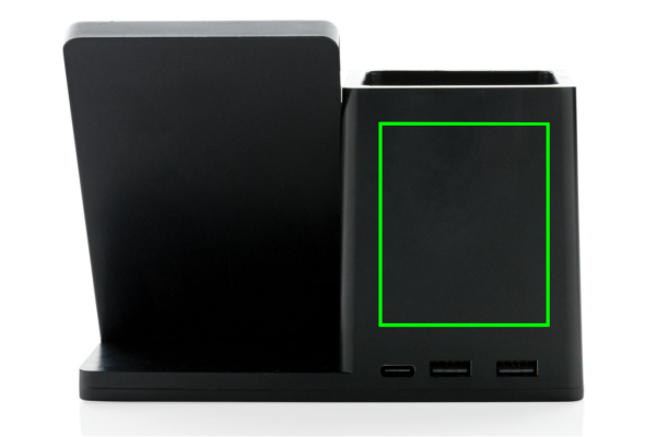 10W fast wireless charger with pen holder made with RCS (Recycled Claim Standard) certified recycled ABS. Total recycled content: 78% based on total item weight. RCS certification ensures a completely certified supply chain of the recycled materials. Bamboo wireless charging area made from FSC 100 bamboo. With two USB ports on the back to charge via cable. Wireless charging compatible with Android latest generations, iPhone 8 and up. Item and accessories PVC free. Including 120 cm type C charging cable made from RCS certified recycled TPE. Packed in FSC mix kraft box. Type-C Input 5V/2A; 9V/2A; Wireless output 5V/1A;9V/1.1A; (10W) Registered design®