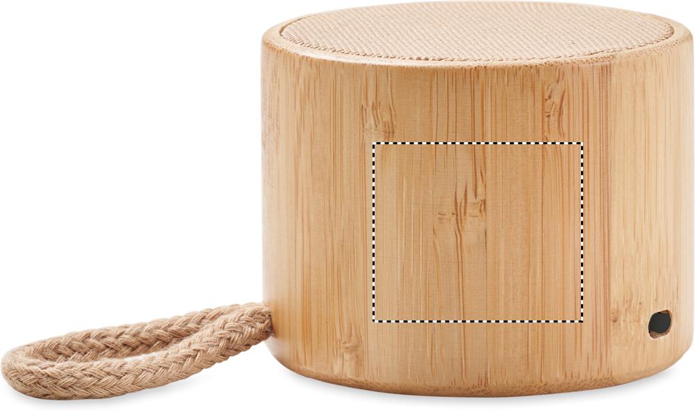 5.1 wireless speaker in ABS with bamboo casing, cotton on top and hanging loop. 1 Rechargeable Li-POL 300 mAh battery included. Includes an SD card port and an AUX/ USB cable. Output data: 3W, 3 Ohm and 5V. Playing time approx. 3h. Bamboo is a natural product, there may be slight variations in colour and size per item, which can affect the final decoration outcome.