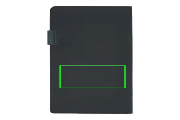 A4 tech portfolio with luxury magnetic metal closure. Inside: a tablet/phone stand, phone holder with see-through window which allows you to view and access your device. Suitable for most common phones. With sleeve for documents, 2 card holders and pen loop. Including recycled A4 notepad.