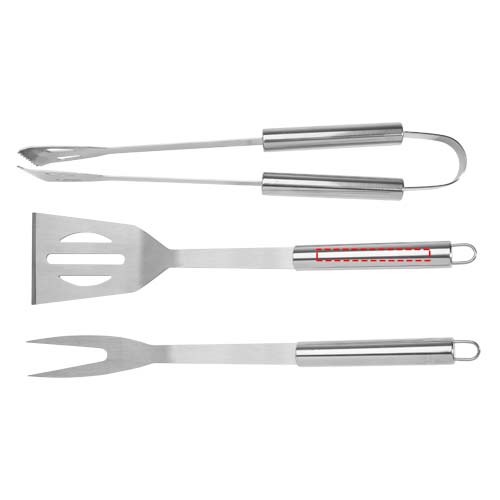 3-osaline grillikomplekt labida (34,8 x 7,5 cm), kahvli (35,4 x 3,35 cm) ja tangiga (35 x 6,8 x 4 cm). Kõik tarvikud tarnitakse kerges ümbrises, et oleks lihtne kaasas kanda ja hoiustada. Ideaalne grillitarvik aeda või sõprade ja perega õues grillimiseks kaasa võtmiseks.