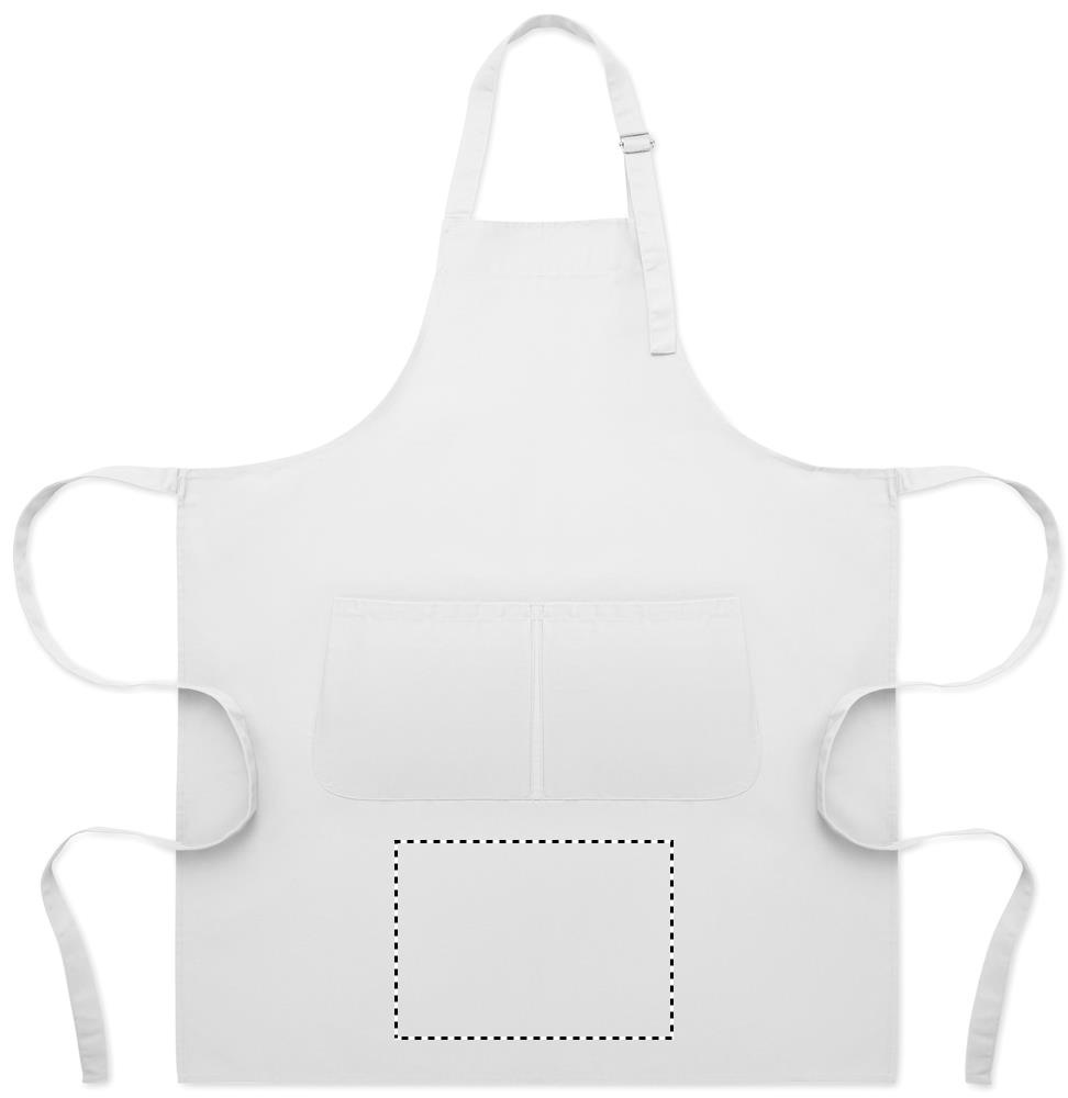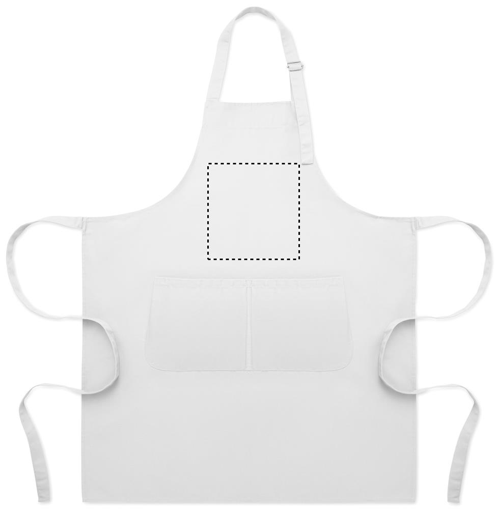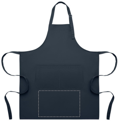 Pikk reguleeritava pikkusega köögipõll 240 g/m² polüpuuvillast (35% puuvill, 65% polüester), millel on kaks esitaskut ja reguleeritav metallpandlaga rihm.