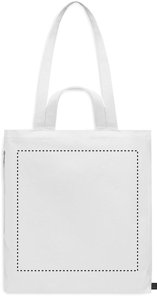 Must taaskasutatud polüpuuvillasest ostu- või rannakott (70% taaskasutatud puuvill, 30% taaskasutatud polüester) lühikeste ja pikkade sangadega. Sellel on külgmine lukuga tasku. 380 gr/m².