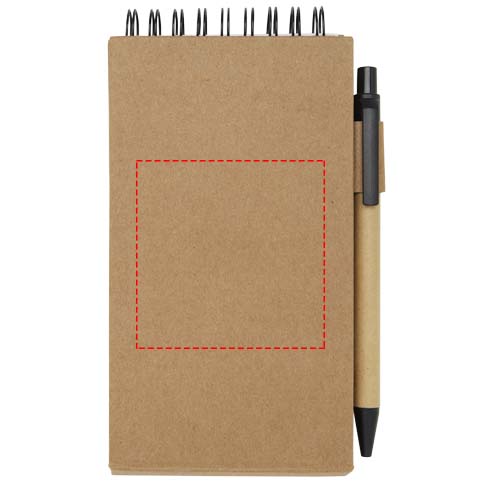 Kleepuv pastapliiatsiga märkmik. Märkmikus on 30 lehte valget 70 g/m2 joonelist paberit (8 x 12 cm). Sellel on ka 25 mitmevärvilist (5 x 1,2 cm) ja 25 kollast (7,5 x 7,5 cm) kleeppaberit, mõlemat tüüpi paberiga 70 g/m2. Pastapliiatsi toru on valmistatud taaskasutatud paberist. Tindi värv: must. Kirjutamise pikkus: 1000 meetrit. Otsa suurus: 1,00 mm.