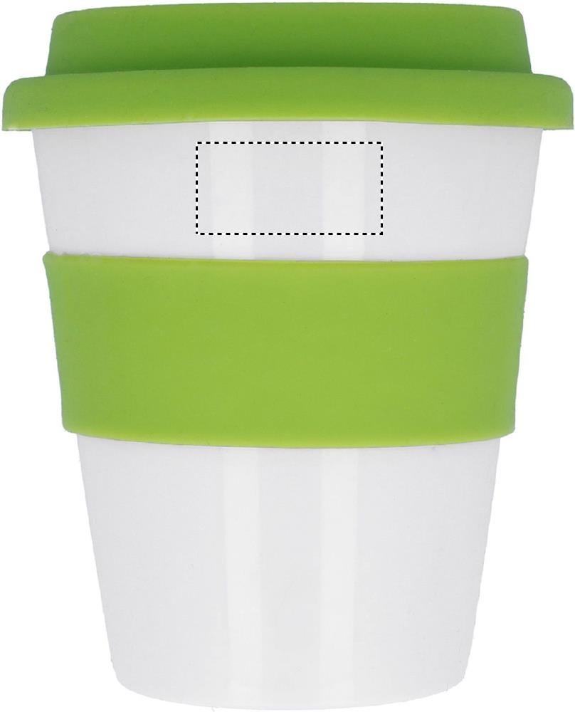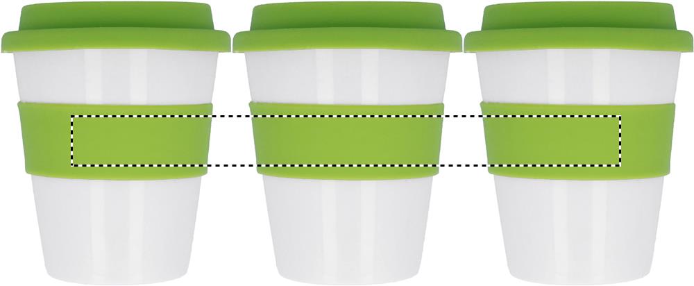 Üheseinaline trummel läikivast valgest PP-st silikoonkaane ja keskmise rõngaga. Mahutavus 350 ml. Kuna see on ühe seinaga kruus, võib soojusülekanne siiski toimuda.