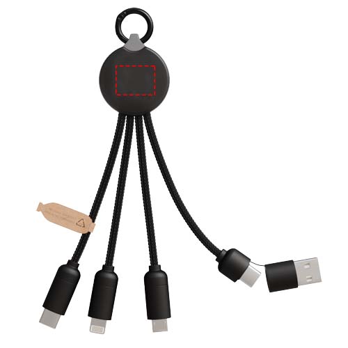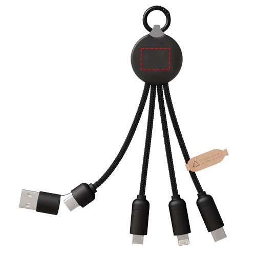 Viis-ühes laadimiskaabel 3 pistikuga (C-tüüp, Android, iPhone) ja rPET-juhtmed (valmistatud taaskasutatud plastpudelitest). Tänu kahele USB-A + USB-C sisendile ühildub kaabel 100% turul uusimate arvutitega (USB-C). Otsakatete metallilise välimusega viimistlus. Kaabliga saab korraga laadida kuni 3 seadet. Tarnitakse taaskasutatavas ümbrises ja taaskasutatud paberkaardis.