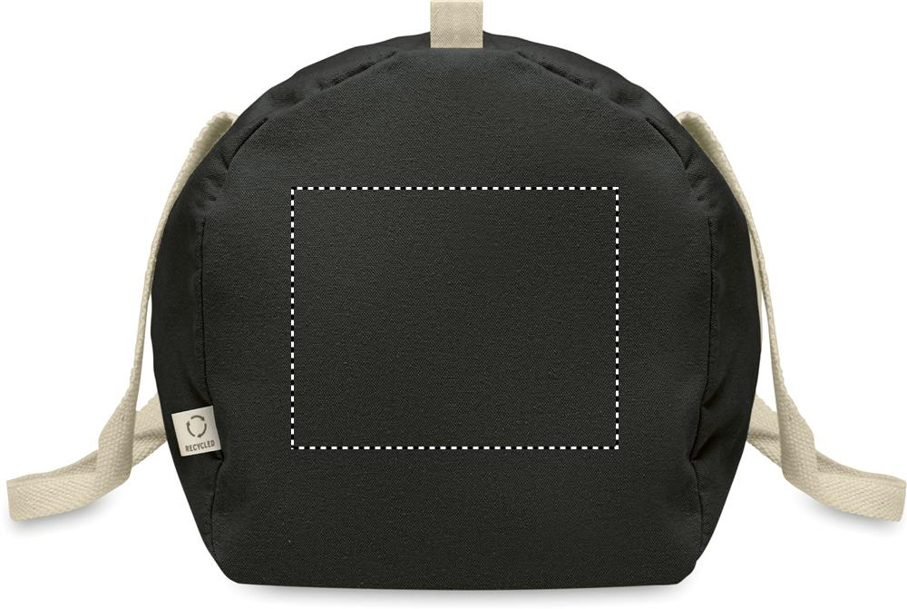 Must pikkade sangadega 320 gr/m² taaskasutatud puuvillast (80%) ja taaskasutatud polüestrist (20%) tõmblukuga küljesahtli ja lukuga sisetaskuga kott, spordi- või reisikott.