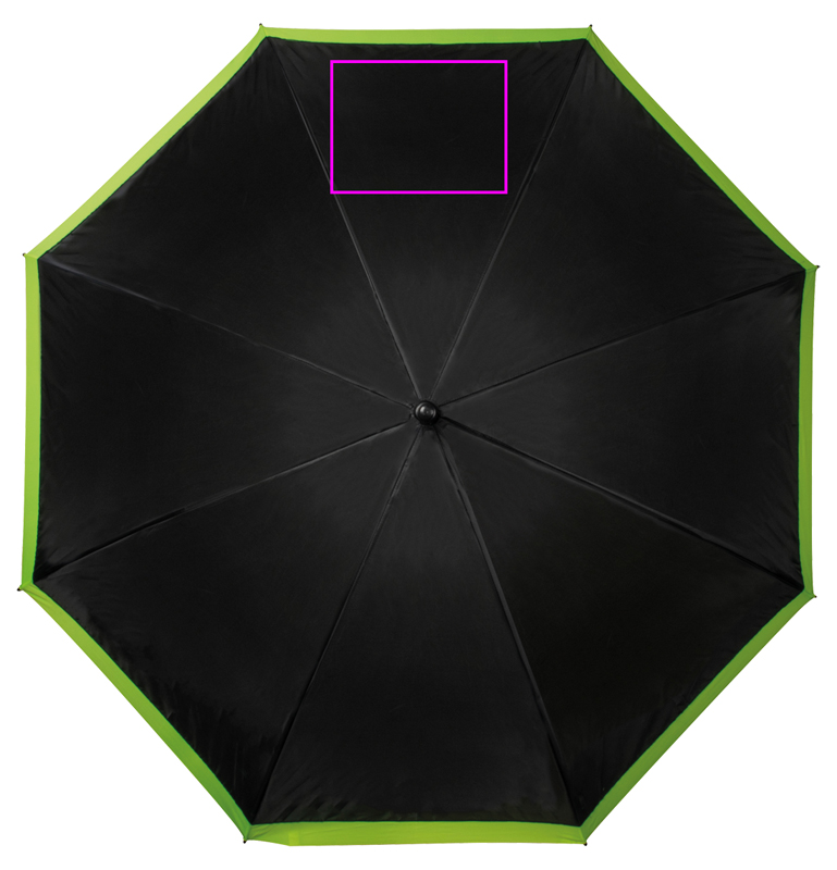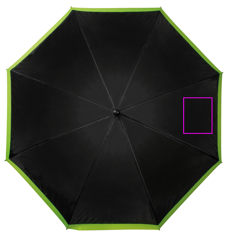 Suur vihmavari, mis tõmbab tähelepanu endale ja teie logole tänu oma musta-neooni ja kollase värvi kontrastile (190T polüester.) Trükime teie logo segmendile.