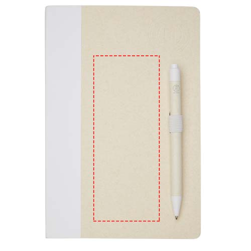 A5-kokoinen muistikirja ja kuulakärkikynäsetti. Tässä muistikirjassa on 80 kierrätetyistä maitotölkeistä (jopa 70 %) valmistettua viivoitettua sivua (80 g/m²), värillinen paperiselkämys ja kynäsilmukka. Kynäsilmukassa on muistikirjan väriä vastaava kuulakärkikynä napsautusmekanismilla. Kynän varsi on valmistettu samasta kierrätettyjen maitopakkausten materiaalista ja sen painike, klipsi ja kärki ovat valmistettu värillisestä PLA-muovista. Musta muste. Käytetyt maitotölkit kerätään, lajitellaan, käsitellään ja muutetaan paperiksi, jolloin jäte todella pääsee hyötykäyttöön.