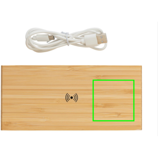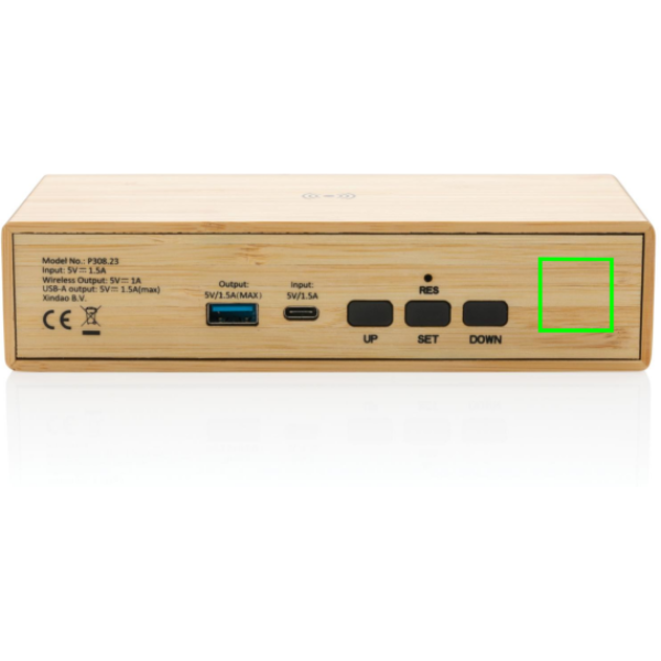 5W langaton laturi ja herätyskello bambuisella ulkokuorella ja 24-tunnin näytöllä. Takapuolella USB portti langallista latausta varten. Sisältää 150 senttisen PVC vapaan TPE micro USB kaapelin. Sopii yhteen kaikkien QI-sopivien laitteiden, kuten uusimpien Android ja iPhone -puhelimien, kanssa. Sisääntulo 5V/1.5A; langaton ulostulo 5V/1A - 5W; 1 USB portti, 5V/1A