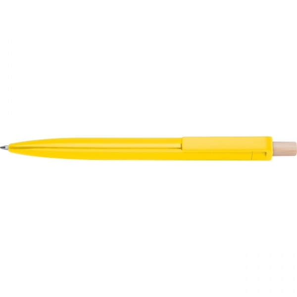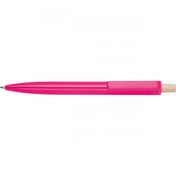 Kierrätetystä ABS-muovista valmistettu kuulakärkikynä, jossa on bambuinen painike. Siinä on sinisellä kirjoitettava muovinen täyttöpakkaus. Logosi on painettu rungon päälle klipsin alle.