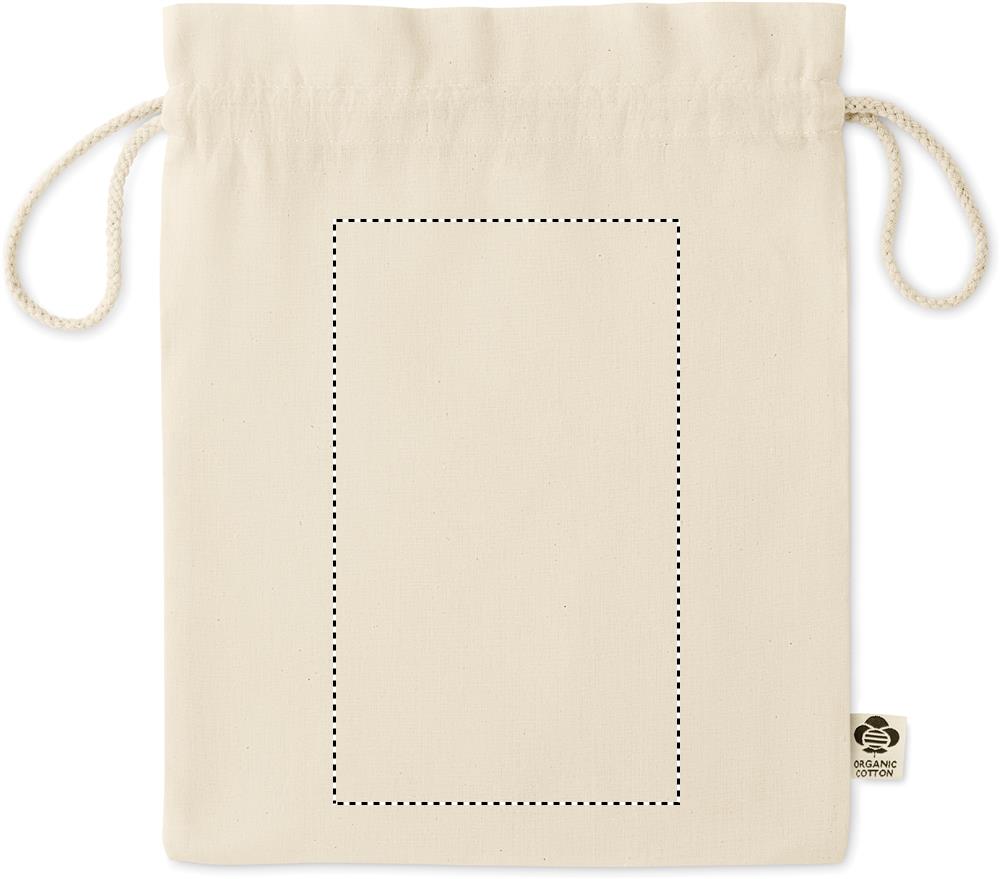 105 gr/m² keskikokoinen orgaanisesta puuvillas valmistettu pussi, kiristysnauhalla.