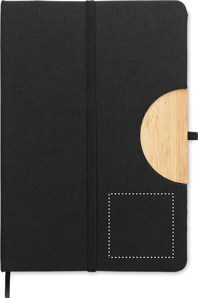 A5 muistikirja kovalla RPET kannella, bambu yksityiskohta toimii puhelintelineenä. 160 viivoitettua kierrätettyä sivua (80 arkkia) ja väriltään yhteensopiva elastinen suljin.
