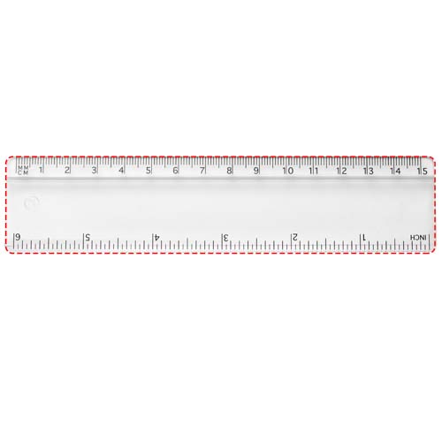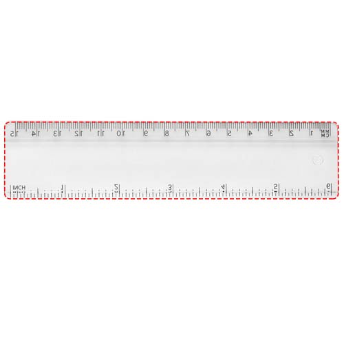Muovinen viivoitin, jossa sekä sentit että tuumat (mitat painetaan vain merkattuun tuotteeseen).
