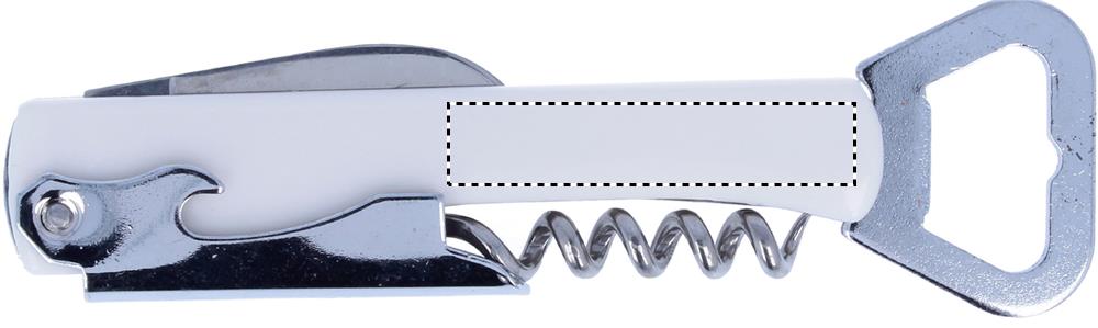 Tarjoilijan veitsi ruostumattomasta teräksestä, korkkiruuvi ja muovinen päällynen.