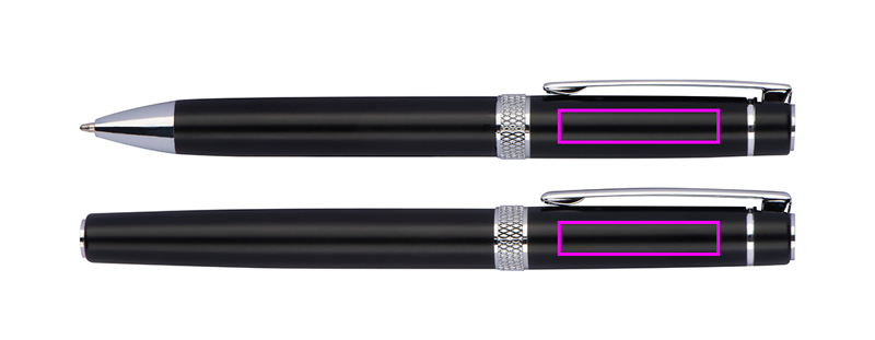 Rašymo rinkinys, kurį sudaro sukamas tušinukas su mėlynos spalvos rašymo sistemos užpildu ir mėlynas rašomasis ritininis rutulys iš aliuminio dėkle. Chromuotos aplikacijos ir blizgantys dekoratyviniai žiedai suteikia rinkiniui elegantišką išvaizdą. Jūsų logotipas bus išgraviruotas ant abiejų rašiklių, esančių klipo dešinėje.