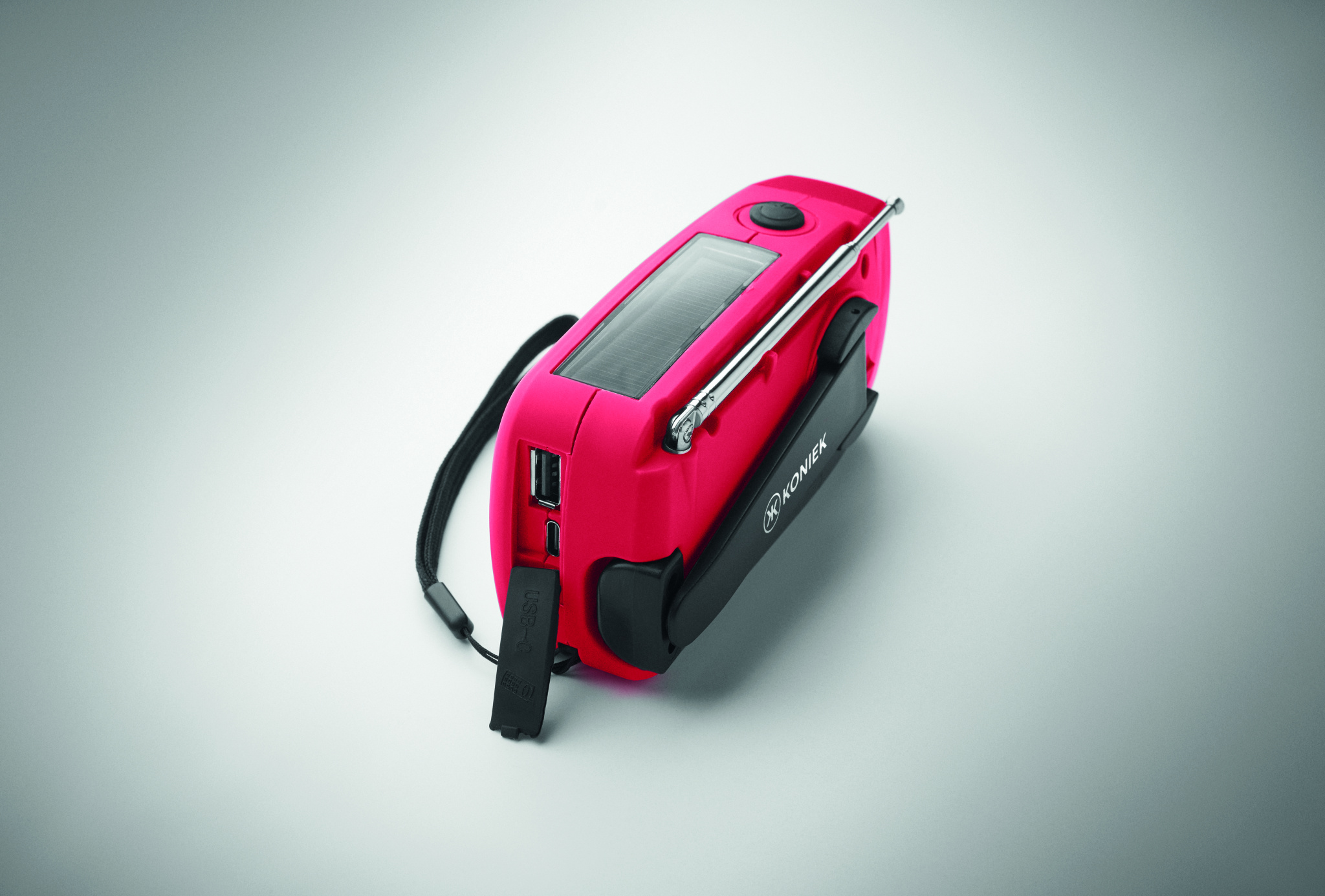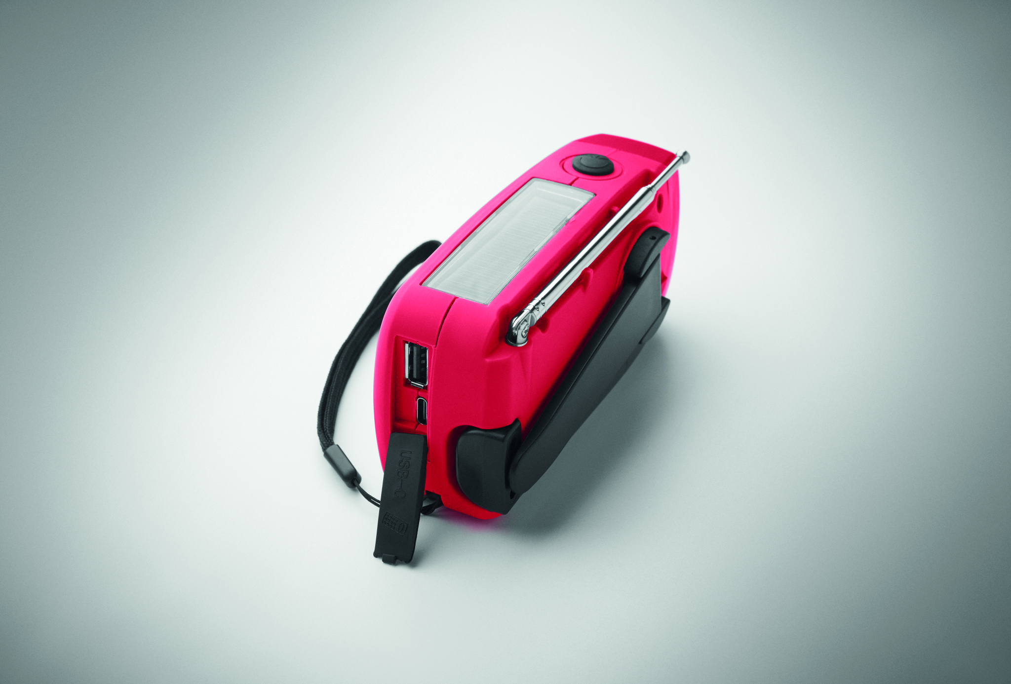 Pārnēsājams AM/FM radio ABS plastmasas korpusā ar LED lukturīti (2 iestatījumi) un 1200 mAh ārējo akumulatoru avārijas uzlādei. Pašdarbinās ar saules enerģiju un rokas kloķi.