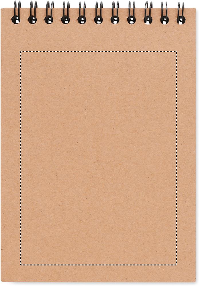 Gredzenveida kraftpapīra piezīmju grāmatiņa, kas ietver 10 melnas skrāpējamas lapas un koka pildspalvu.