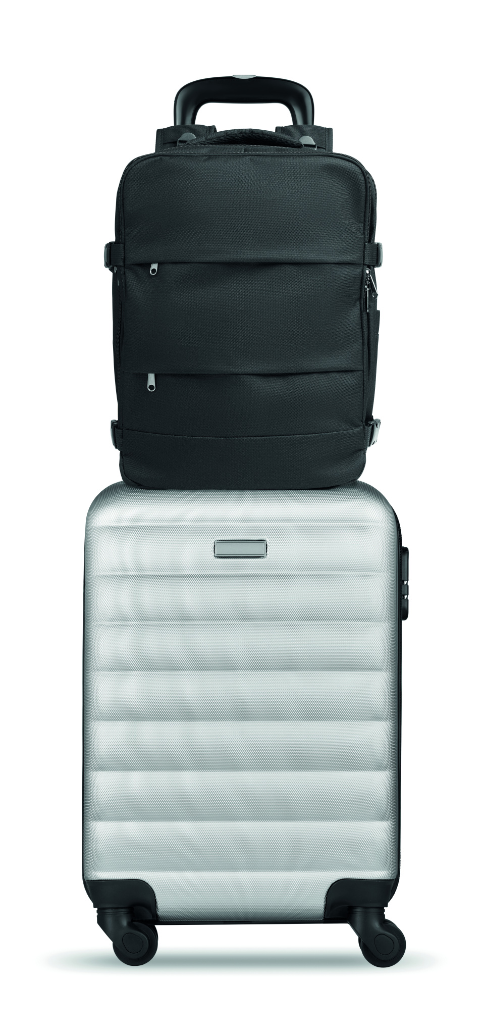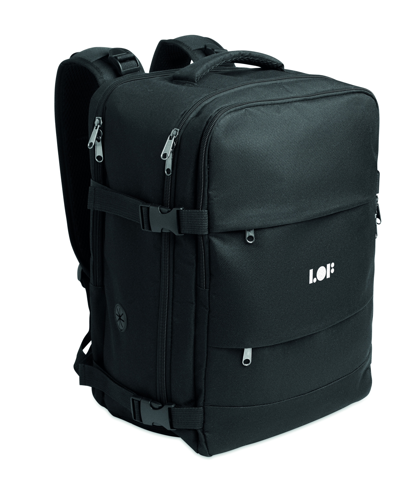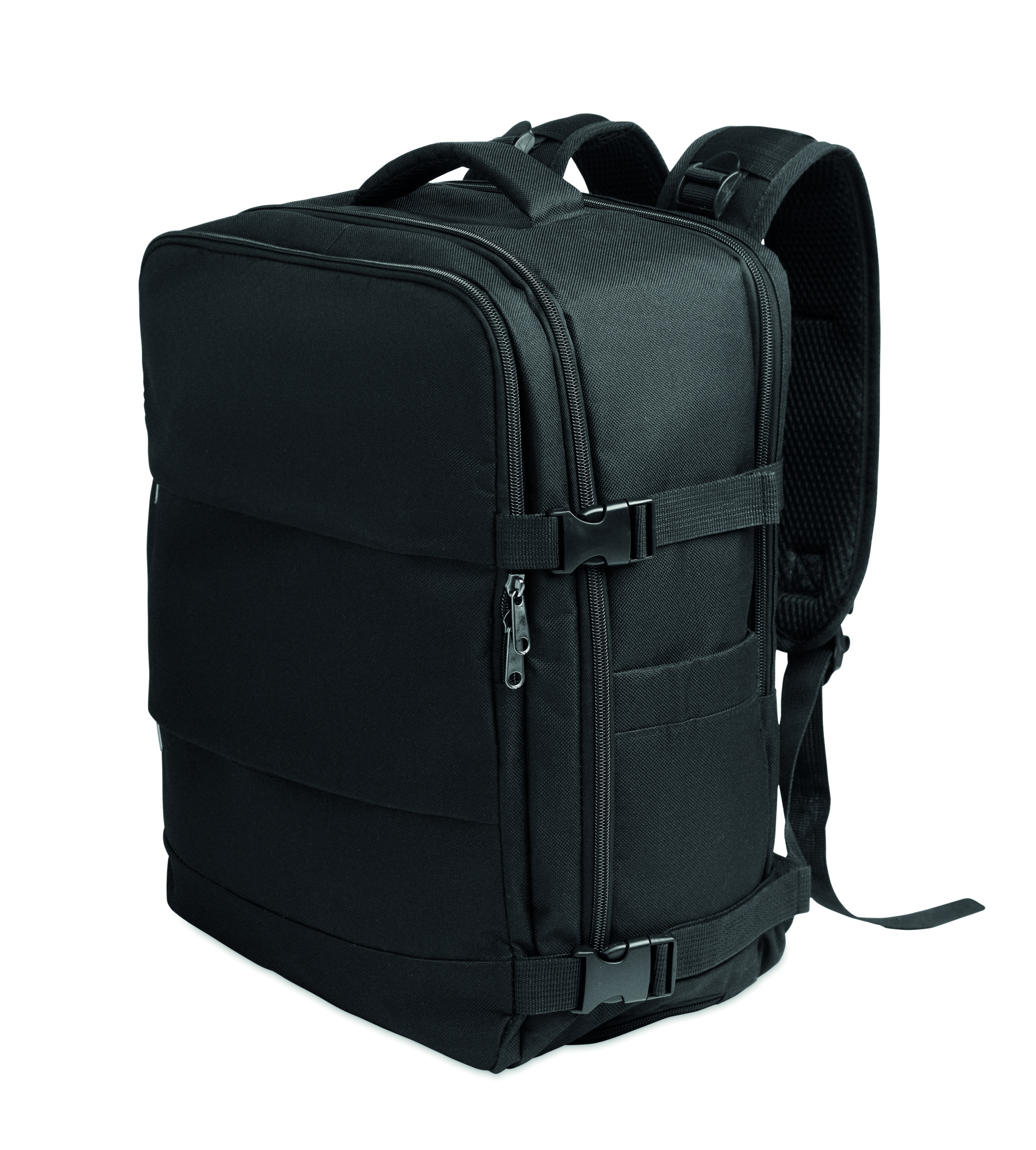 Cabin-size extendable backpack in 600D RPET polyester with PU backing and 180o opening. Includes shoe division, padded 15'' laptop pocket, mesh straps, luggage strap, and side buckles.