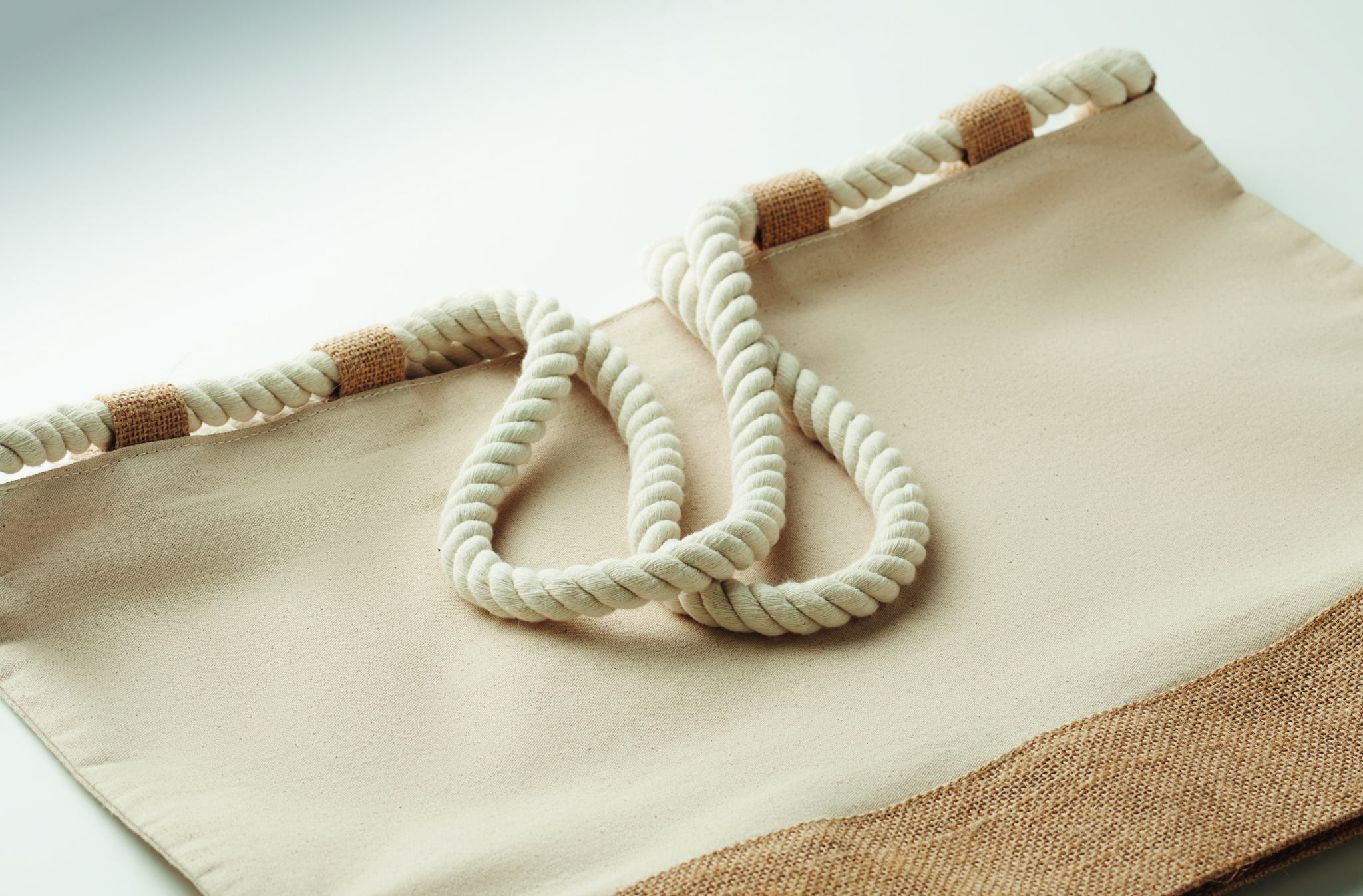 Beach bag in 280 gr/m² cotton canvas and jute with cord handles. Features zipper closure, jute-covered bottom and 10 jute loops.