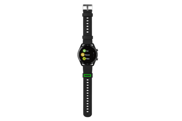 Современные стильные часы с круглым сенсорным экраном 1,28 дюйма для отслеживания вашей активности в течение всего дня. Со встроенным микрофоном для ответа на телефонные звонки на часах. Изготовлены из переработанного термополиуретанового браслета с сертификатом RCS (Recycled Claim Standard) и металлической рамы. Общее содержание переработанных материалов: 22% от общего веса изделия. Сертификация RCS гарантирует полностью сертифицированную цепочку поставок переработанных материалов. Функции включают: подсчет шагов, калорий, расстояние, отслеживание нескольких видов спорта, будильник, отслеживание сердечного ритма, мониторинг артериального давления, мониторинг сна, обновления календаря, совершение и прием звонков, уведомления: SMS, Facebook, Skype, WhatsApp, Twitter и т. д. Совместимы с Android 4.4 и IOS 8.0 и выше.. BT 4.0. Время работы в режиме ожидания 15 дней и время работы до 5 дней. В комплект входит зарядное устройство-клипса для зарядки часов. Упакованы в упаковку из крафт-бумаги FSC® mix. Изделие и аксессуары на 100% не содержат ПВХ.