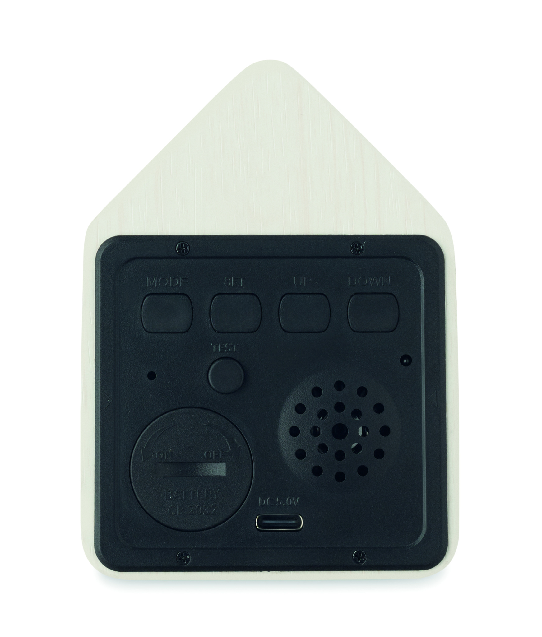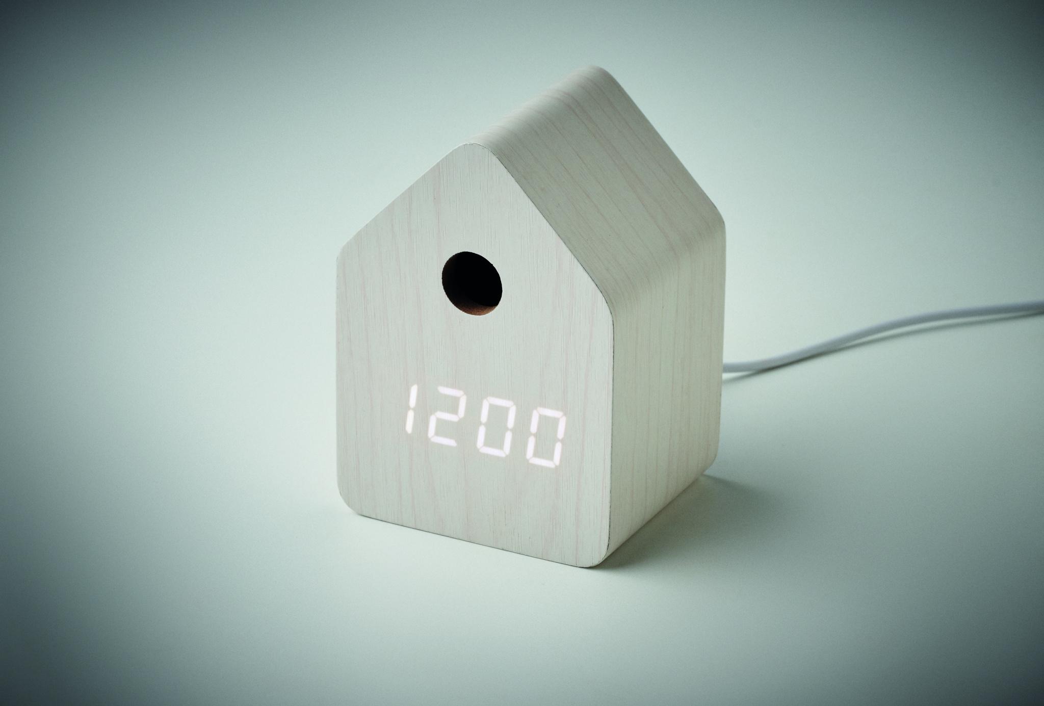 Small MDF desk clock including a built-in alarm with bird cuckoo voice and temperature display. Bird cuckoo voice every full hour and during alarm. White LED display. Sound is automatically silenced between 22.00h to 06.00h. 5 mins snooze intervals