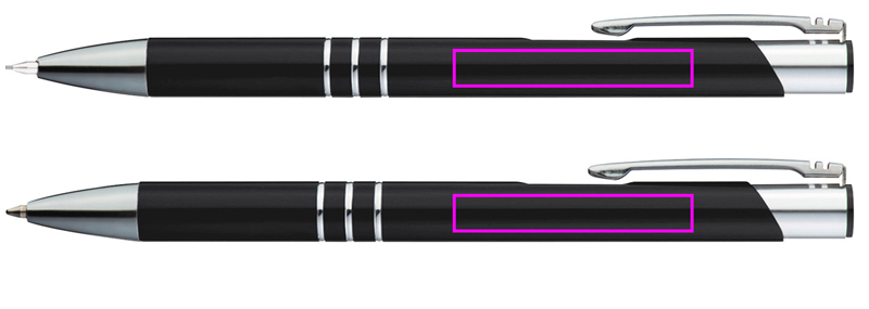Письменный набор из алюминия, состоящий из шариковой ручки с синим стержнем большой емкости и механического карандаша, каждый с декоративными кольцами. Ваш логотип будет выгравирован справа от зажима.