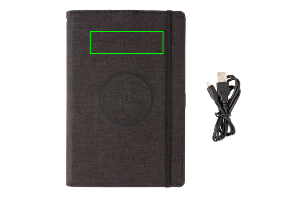 Чехол для ноутбука Air 5W с функцией беспроводной зарядки позволяет заряжать смартфон без кабелей. Просто положите телефон сверху и начните заряжать! Он поставляется с кабелем micro USB длиной 80 см, поэтому вы можете легко подключить чехол к любому источнику питания. Чехол изготовлен из полиэстера и имеет эластичную застежку. Внутри блокнота есть черная мягкая обложка из полиуретана и 80 листов/160 линованных страниц кремовой бумаги плотностью 70 грамм. Вход: 5 В/2 А - Беспроводной выход: 5 В/1 А. Зарегистрированный дизайн®