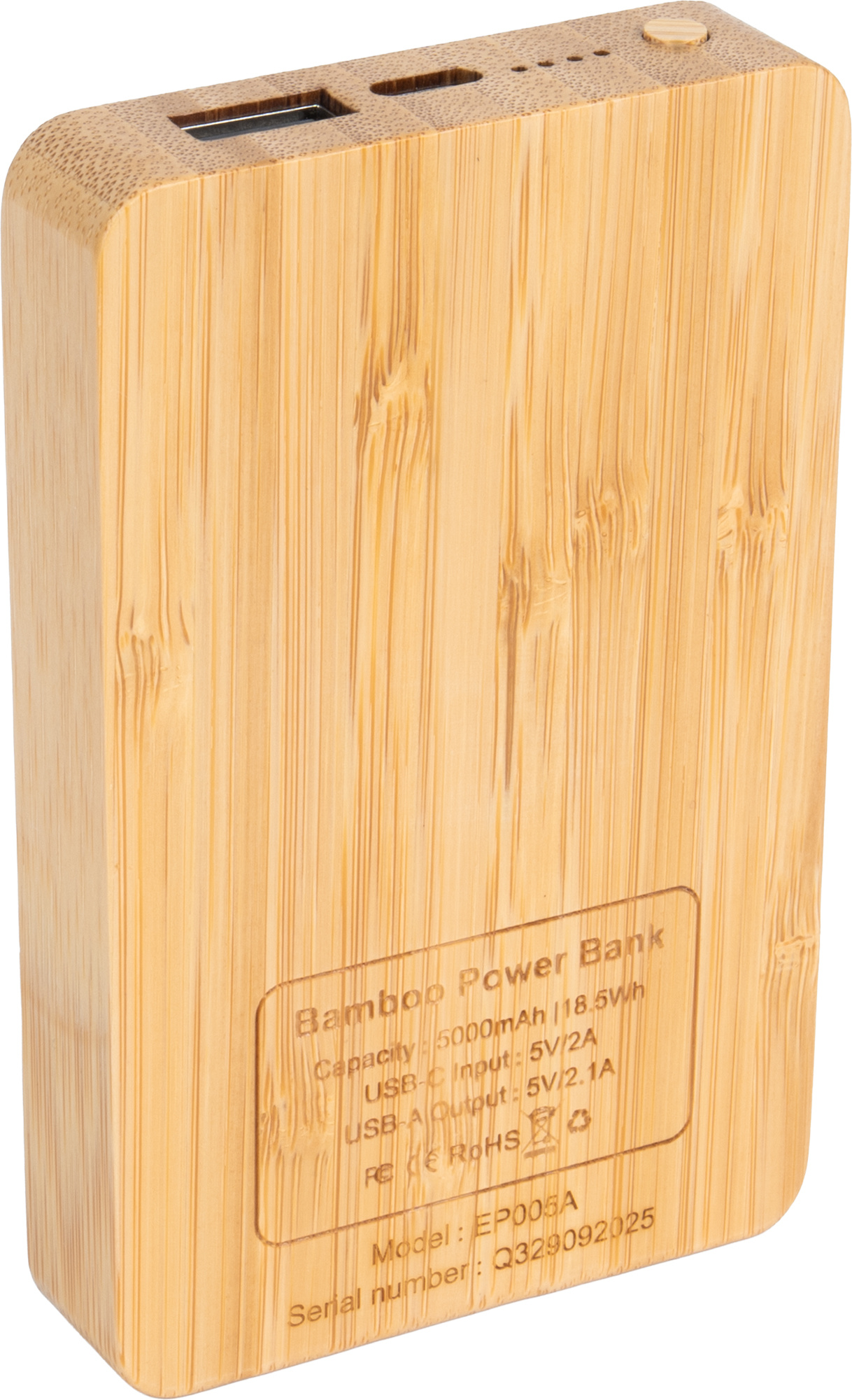 Этот портативный аккумулятор емкостью 5000 мАч, выполненный в бамбуковом стиле, сочетает в себе естественную эстетику и современную функциональность. Выгравированный логотип подсвечивается при включении устройства, добавляя стильный и узнаваемый визуальный штрих. Четыре светодиодных индикатора отображают текущий уровень заряда батареи, а вход/выход USB-C (5 В/2 А) и выход USB (5 В/2 А) обеспечивают быструю и надежную зарядку. В комплект входит кабель USB-C, поэтому портативный аккумулятор готов к использованию сразу после распаковки.