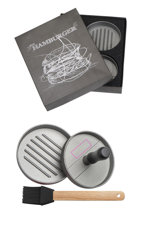Пресс для котлет из алюминия с силиконовой щеткой, упакован в индивидуальную коробку. Наклеиваем на коробку ваш логотип с этикеткой.