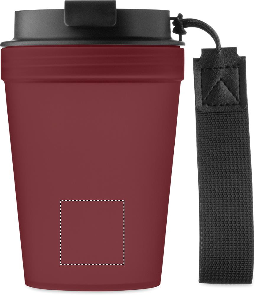Single wall tumbler in PP, with RPET polyester strap. Leak-free. Capacity: 300 ml. As this is a single walled tumbler, heat transfer can still occur.