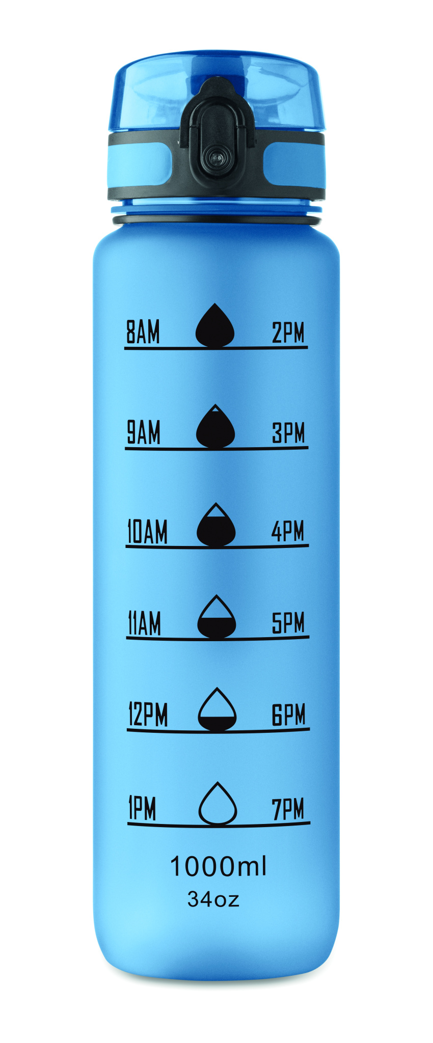Sports water bottle in RPET, motivational time markings, one hand opening flip top lid, safety lock and carrying strap. Leak-free. Capacity: 1L.
