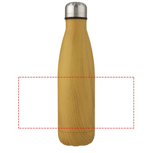 Vakuumisolerad flaska av rostfritt stål med en ikonisk design och efterbehandlad med trä-effekt. Det isolerade 18/8 rostfria stålet håller drycker varma eller kalla i flera timmar. BPA-fri, testad och godkänd enligt tysk lagstiftning om livsmedelssäkerhet (LFGB). Testad och godkänd för ftalatinnehåll enligt REACH-förordningarna. Med en bas som passar i de flesta mugghållare är den här snygga vattenflaskan en perfekt reklamartikel. Volymkapacitet 500 ml. Handdisk rekommenderas. Levereras i en återvunnen presentförpackning av kartong.