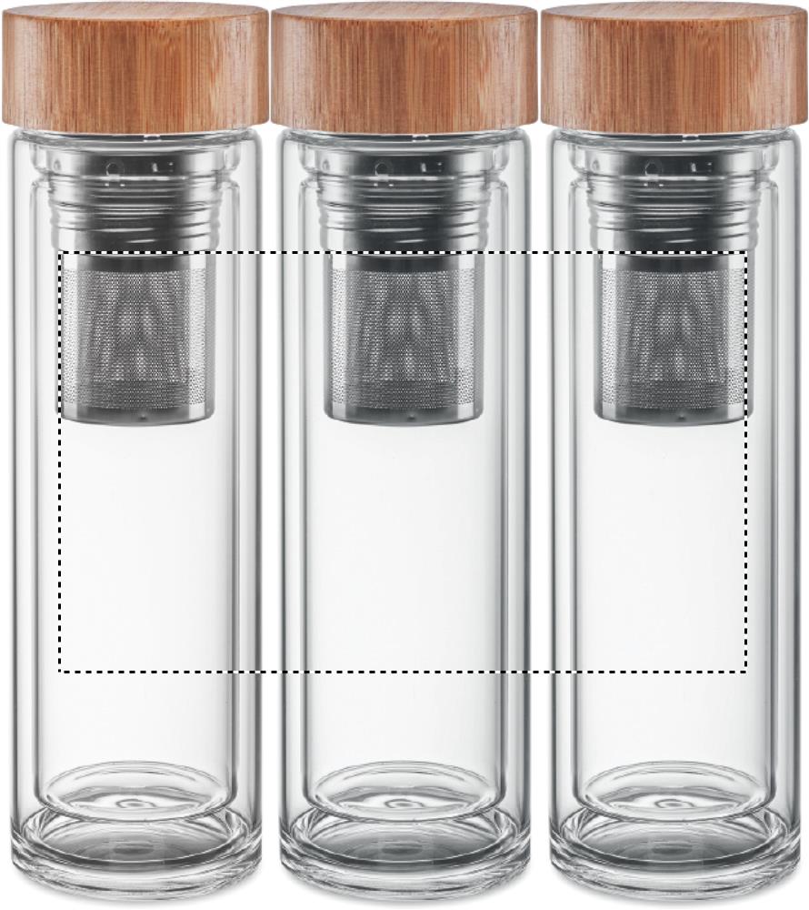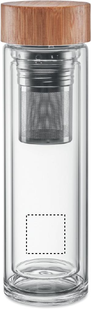 Tillbringare med dubbelvägg i värmetåligt glas och bambulock. Inbyggd the sil. Rymmer 400ml. Läckagefritt.