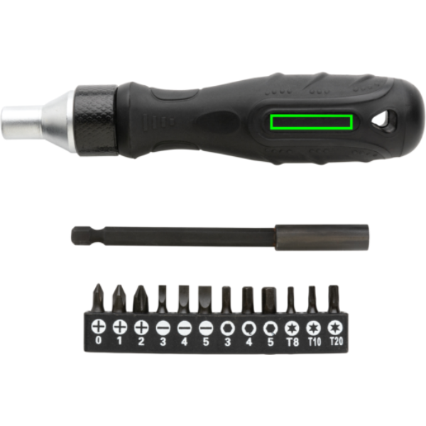 Lyxig spärrskruvmejsel med skaft och bits i S2 legerat stål. Setet innehåller följande bits: PH0/PH1/PH2,SL3/SL4/SL5/HEX3/HEX4/HEX5/TX8/TX10/TX20. Enkla att fästa med en extra stark magnet. Levereras i giftbox. Hårdhet för bits 60-62 HRC.