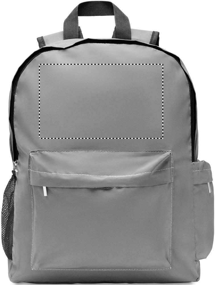 Ryggsäck i högreflekterande 190T polyester med snöre på framsidan. Vadderad rygg, remmar och botten. Den har ett fack för bärbar dator. max 15'' Ficka med dragkedja på framsidan och en nätficka på sidan och andra fickor med dragkedja på sidan.