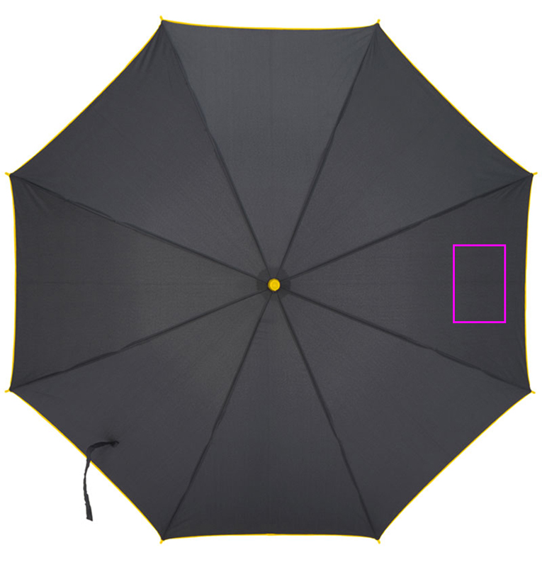 Automatiskt paraply av 190T pongee med glasfiberstavar, plasthandtag, färgad kant, handtag och ram. Vi trycker din logotyp på ett segment.
