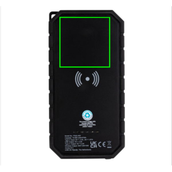 Snabb 10.000 mAh solcellspowerbank med 10W trådlös laddning tillverkad av RCS (Recycled Claim Standard) certifierad återvunnen ABS och TPE. Totalt återvunnet innehåll: 30% baserat på total produktvikt. RCS certifiering säkerställer en helt certifierad leveranskedja av de återvunna materialen. Powerbanken stödjer laddning både via kabel (type C och USB) och 10W trådlös snabbladdning. Trådlös laddning är kompatibel med alla QI-aktiverade enheter som senaste generationen Android, iPhone 8 och upp. Den har en solscellspanel, ficklampa och karbinhake. IPX5 vattentät. Med batteriindikator. Type C laddningskabel i GRS certifierad återvunnen TPE medföljer. Levereras i FSC® mix kraft förpackning. USB Output: 5V/2.4A; Type C Output: 5V/2.4A. Produkt och accessoarer är 100% PVC-fria.